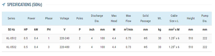 Power 1hp atau 750watt, tersedia 1phase (220v) dan 3phase (380v), 2 poles, discharge 4 inch atau 100mm, max head 5.8 meter, max flow 0.9 m3/menit, berat 33kg