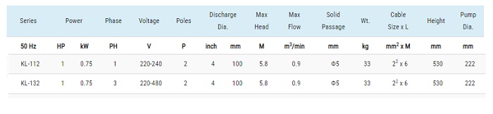 Power 1hp atau 750watt, tersedia 1phase (220v) dan 3phase (380v), 2 poles, discharge 4 inch atau 100mm, max head 5.8 meter, max flow 0.9 m3/menit, berat 33kg