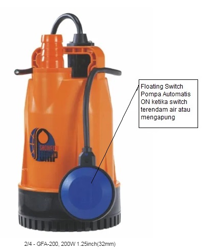 Pompa Showfou body bahan plastik atau dikenal dengan nama seri Goldfish atau seri GF, merupakan jenis pompa submersible power 200 watt model automatis dengan floating switch
