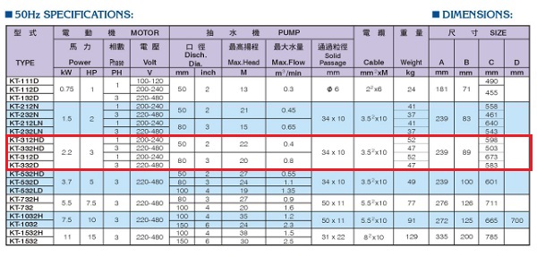Power 3 atau 2.2kw, 3phase atau 320-480v, 2poles, pipa 2inch atau 50mm, max head 22 meter, max flow 0.45m3/menit, berat 47kg