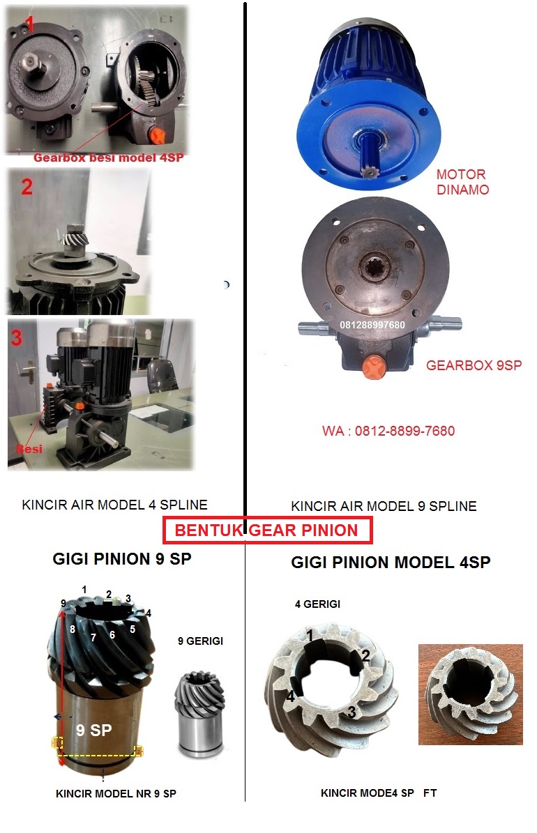 Kincir tambak dengan sistem gearbox yang banyak beredar di Indonesia memiliki 2 model yaitu 4sp atau FT dan model 9sp atau NR, hal ini bisa di lihat dari bentuk as/shaft motor dan bentuk gear pinion, pada model 4sp masih terdapat gear pinon yg terpasang di motornya dan bentuk gearbox terbuka, sedangkan model 9sp sudah tidak gunakan gear pinion di motornya tapi gear pinion sudah terpasang di dalam gearbox, dengan as/shaft 9sp atau 9 gerigi klop ke lobang gear pinion 9sp